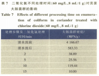表6-表8各自為二氧化氯不一樣濃度值(水菜容積質(zhì)量比8m1:1g、10min)、不一樣解決時間(濃度值60mg/1、水菜容積質(zhì)量比8m1:1g)和不一樣水菜容積質(zhì)量比(濃度值60mg/1、10min)對香菜表層大腸桿菌減菌的實際效果:香菜經(jīng)冷水洗后大腸桿菌數(shù)廣泛減少1~2個量級,與對比(冷水洗后)對比,不一樣濃度值(表6)、不一樣水菜容積質(zhì)量比(表8)2個解決組均將大腸桿菌數(shù)操縱在最低標(biāo)準(zhǔn),不一樣解決時間(表7)解決組因為初始大腸桿菌數(shù)較高而無法操縱在最低標(biāo)準(zhǔn),但仍可保證在較適度性。