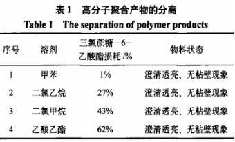 用活性炭過濾高分子材料高聚物的情況下,也會(huì)粘附很多的三氯蔗糖-6-乙酸酯,事后必須 分析三氯蔗糖-6-乙酸酯,實(shí)際操作相對(duì)性繁雜。因而大家采用了四種有機(jī)溶液來分離出來高分子材料高聚物,二甲苯、二氯乙烷、二氯甲烷、乙酸丁酯做為萃取劑,每一種有機(jī)溶劑使用量為鈦酸異丙酯液態(tài)積的10%,1:1(v/v)一次提純,比照三氯蔗糖-6-乙酸酯的消耗及原材料情況。結(jié)果如表1所顯示。