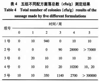 菌落總數(shù)、大腸桿菌測(cè)量結(jié)果:臘腸在一個(gè)月儲(chǔ)存期內(nèi),每星期開展微生物檢驗(yàn)新項(xiàng)目菌落總數(shù)、大腸桿菌的測(cè)量,結(jié)果見(jiàn)表4,表5。