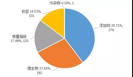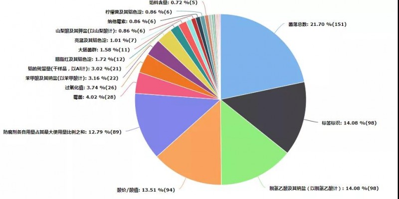 在其中菌落總數(shù)超標(biāo)準(zhǔn)、標(biāo)識(shí)標(biāo)志不過關(guān)、脫氫乙酸以及醋酸鹽超標(biāo)準(zhǔn)、過氧化值超標(biāo)準(zhǔn)、添加劑分別使用量占較大需求量占比之和超1等難題是導(dǎo)致月餅不過關(guān)的首要緣故。詳細(xì)信息見圖3: