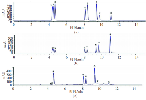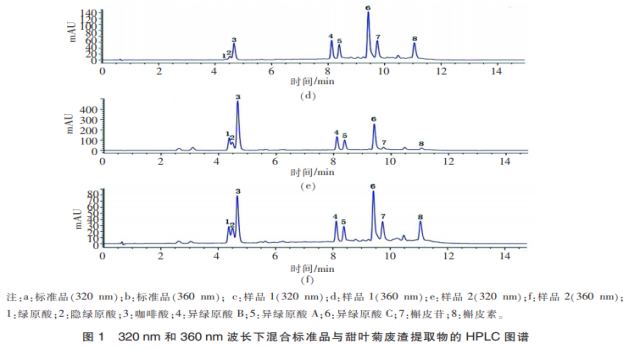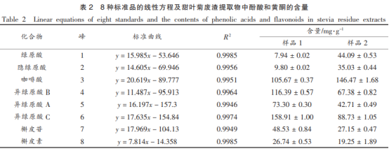 依照甜葉菊廢料提取液的主要成分為咖啡酸、綠原酸、隱綠原酸、異綠原酸A、異綠原酸B、異綠原酸C、原兒茶醛和槲皮苷。選用HPLC法對(duì)二種甜葉菊廢料提取液中的主要成分開展定性分析。高效率液相色譜儀標(biāo)準(zhǔn)為:AgilentEclipsePlusC18色譜柱(50mm×2.1mm,1.8μm),流動(dòng)性相為0.1%苯甲酸(A)和工業(yè)甲醇(B),流動(dòng)速度0.1mL/min。過柱程序流程:0~10min,10%~50%(B);10~12min,50%~10%(B);12~15min,10%(B)。檢驗(yàn)光波長(zhǎng)320nm和360nm,柱溫30℃,進(jìn)樣量1μL。選用咖啡酸、綠原酸、隱綠原酸、異綠原酸A、異綠原酸B、異綠原酸C、原兒茶醛和槲皮苷為標(biāo)準(zhǔn)物質(zhì),按以上色譜儀標(biāo)準(zhǔn)各自測(cè)量。以標(biāo)準(zhǔn)物質(zhì)的質(zhì)量摩爾濃度為橫坐標(biāo)軸,峰總面積為縱軸,制作HPLC標(biāo)曲,并測(cè)量二種甜葉菊廢料提取液中各主要成分的成分,根據(jù)與標(biāo)準(zhǔn)物質(zhì)出峰時(shí)間相較為,從甜葉菊廢料提取液中分離出來并檢驗(yàn)到6種酚酸(320nm)和2種黃酮類(360nm),如圖所示1所顯示。選用外標(biāo)法對(duì)以上8種主要成分成分開展測(cè)量,結(jié)果見表2。試品1中總酚酸的成分為(472.01±2.28)mg/g,黃酮類物質(zhì)的成分為(75.27±1.37)mg/g,在其中占比最多的3種成份先后為異綠原酸C(158.91±1.00)mg/g、異綠原酸B(116.39±0.57)mg/g和咖啡酸(105.67±0.37)mg/g。試品2中總酚酸的成分為(424.41±5.01)mg/g,黃酮類物質(zhì)的成分為(46.4±2.36)mg/g,在其中占比最多的3種成份先后為咖啡酸(146.47±1.68)mg/g、異綠原酸C(88.73±1.05)mg/g和異綠原酸B(67.38±0.82)mg/g。從效果中看得出,二種甜葉菊廢料提取液都含有酚酸和黃酮類化合物、多糖類化學(xué)物質(zhì),在其中,試品1中酚酸和黃酮類化合物、多糖類化學(xué)物質(zhì)的總數(shù)量均超過試品2,且二種試品各構(gòu)成成份成分中間也存有差別,試品1綠原酸類物質(zhì)占比較多,試品2咖啡酸成分較多。這種成份具備各種生物活性,如降低膽固醇,抗氧化性,抗發(fā)炎,延緩衰老等。因而對(duì)甜葉菊廢料提取液開展科學(xué)研究,能為其進(jìn)一步開發(fā)設(shè)計(jì)運(yùn)用給予根據(jù)。
