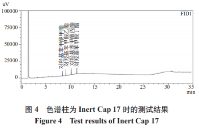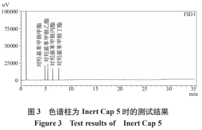 對(duì)甲基苯甲醛脂類(lèi)具備酚羥基構(gòu)造,因而本試驗(yàn)挑選 InertCap1,InertCap5,InertCap1301,InertCap17與InertCapWAX在柱溫箱為100℃,標(biāo)液濃度值均為50μg/mL的標(biāo)準(zhǔn)下實(shí)現(xiàn)檢測(cè),結(jié)果譜圖如2~6。