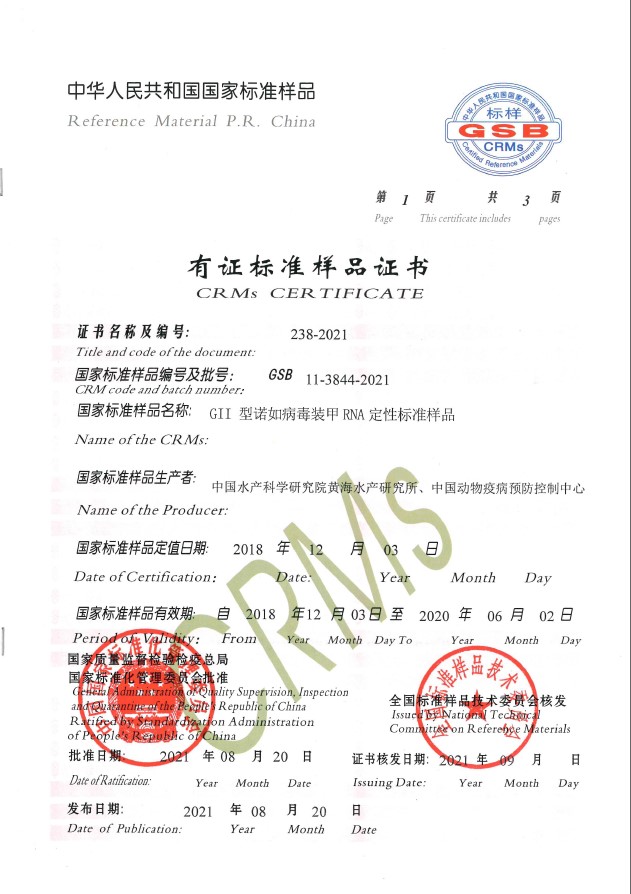 近日,國家市場監(jiān)管質(zhì)監(jiān)總局、我國規(guī)范化管理聯(lián)合會協(xié)同公布國家行業(yè)標(biāo)準(zhǔn)公示(2021年第16號)。中國水產(chǎn)科學(xué)院江海水產(chǎn)品研究室海產(chǎn)品品質(zhì)與安全性調(diào)研室姚琳副研究員帶頭研制的“GII型諾如病毒盔甲RNA判定規(guī)范試品”(國家行業(yè)標(biāo)準(zhǔn)試品序號:GSB 11-3844-2021)宣布得到 準(zhǔn)許、公布。