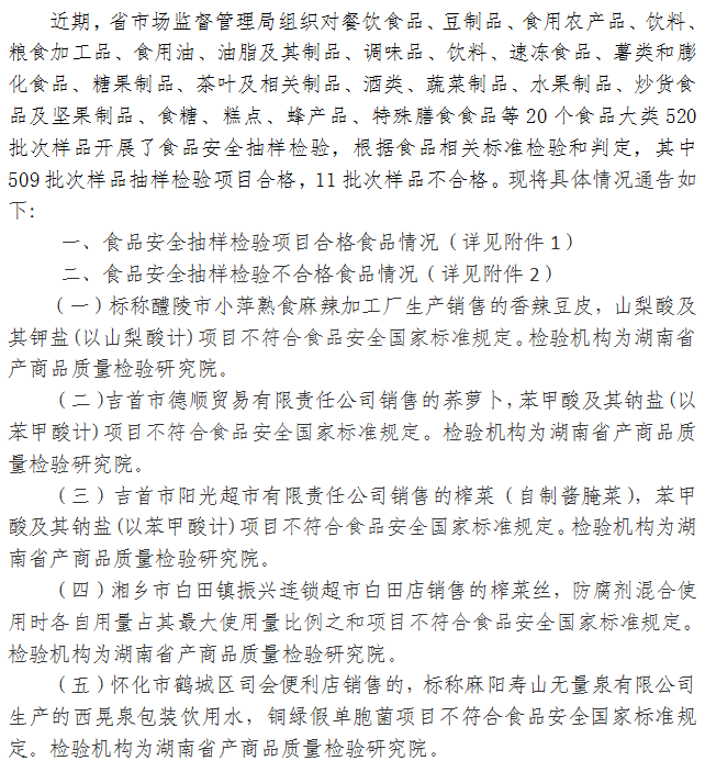 湖南銷售市場監(jiān)督管理局有關(guān)520批號食品衛(wèi)生安全抽樣檢查狀況的通知(2021年第21期)