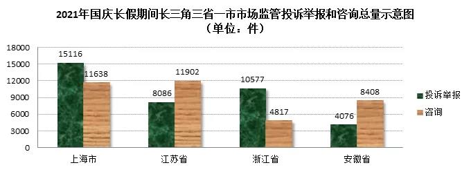 假期期內(nèi),三省一市12315系統(tǒng)共收到投訴37855件、解釋資詢36765件。