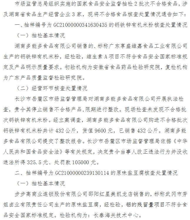 湖南省市場監(jiān)督管理局關(guān)于2批次不合格食品核查處置情況的通告