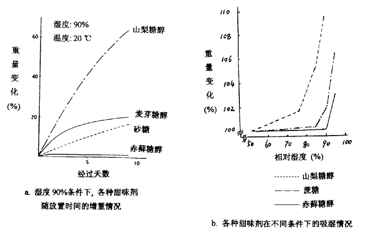 赤蘚糖醇結(jié)晶性好,吸濕性低,易于粉碎制得粉狀產(chǎn)品。在相對(duì)濕度90%的環(huán)境中也不吸濕,比蔗糖更難吸濕(圖2)。用粉狀體時(shí),操作工序同砂糖。