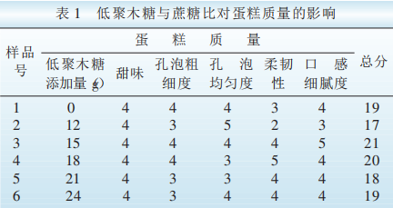 由表1可知,低聚木糖的用量為15g時(shí),蛋糕的甜味較適當(dāng),孔泡粗細(xì)均勻,柔韌性好,口感細(xì)膩、無(wú)粗糙感,如再增加低聚木糖的用量,則蛋糕的品質(zhì)有所降低,故低聚木糖用量為15g時(shí)效果佳。