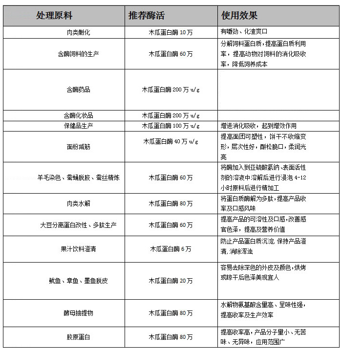 利用木瓜蛋白酶的酶促反應(yīng),可把食品中大分子的蛋白質(zhì)水解成易于吸收的小分子肽或氨基酸,廣泛適用于如:雞、豬、牛、海產(chǎn)品、血制品、大豆、花生等動(dòng)植物蛋白酶解、肉類嫩化劑、酒類澄清劑、餅干松化劑、面條穩(wěn)定劑、保健食品、醬油釀造及酒類發(fā)酵劑等,即可提高食品的營(yíng)養(yǎng)價(jià)值,又可降低成本。
