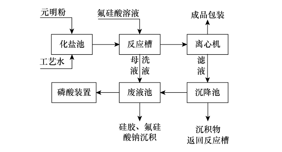氯化鈉法是以工業(yè)級(jí)氯化鈉和氟硅酸為原料,生成氟硅酸鈉和鹽酸,氯化鈉法工藝流程較長,分為化鹽、化灰、反應(yīng)離心、中和、沉降、壓潓、包裝等工序,生產(chǎn)粗放,產(chǎn)生大量含氯廢水及廢渣,外排污染環(huán)境。