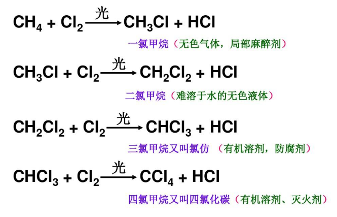 要使這些混合物彼此分離是比較困難的,但在工業(yè)生產(chǎn)上,可以用控制反應(yīng)時(shí)的條件如調(diào)節(jié)氯氣和甲烷的用量來(lái)使某一鹵代產(chǎn)物成為主要產(chǎn)物。這些產(chǎn)物除都可用作有機(jī)溶劑外,其中三氯甲烷還是制造“塑料王”聚四氟乙烯的重要原料,而四氯化碳又可用作滅火劑。