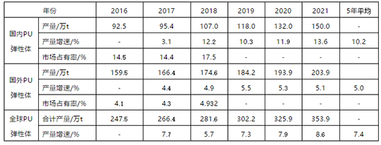 表2? 我國(guó)及全球聚氨酯彈性體產(chǎn)量情況