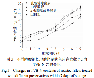 食品的pH能反映食品的酸堿性,也是評價食品品質(zhì)的一個重要指標。通過檢測食品的pH,可以確保食品的品質(zhì)并且能增加食品的穩(wěn)定性,從而延長食品的保質(zhì)期。由圖1可知,使用3種不同防腐劑處理的烤制魷魚和空白組烤制魷魚的pH隨著貯藏時間的增長呈現(xiàn)上升的趨勢。0~2d時,ε-聚賴氨酸鹽處理組、山梨酸鉀處理組和空白組烤制魷魚的pH無顯著性差異;第3~7d時,空白組和ε-聚賴氨酸鹽處理組烤制魷魚的pH明顯高于山梨酸鉀處理組,可能與此時期TVB-N含量的上升有關(guān),TVB-N的本質(zhì)主要是蛋白質(zhì)分解產(chǎn)生的氨以及胺類等堿性含氮物質(zhì),由此可見是因為空白組和ε-聚賴氨酸鹽處理組烤制魷魚的蛋白質(zhì)分解導(dǎo)致TVB-N含量的上升從而導(dǎo)致pH升高。在整個貯藏過程中,Nisin處理的烤制魷魚的pH始終明顯低于ε-聚賴氨酸鹽處理組、山梨酸鉀處理組和空白組,這是因為Nisin本身呈酸性,其可以降低周圍介質(zhì)的pH,這是Nisin處理組pH始終明顯低于其他3組的主要原因。在整個貯藏期間,使用Nisin、山梨酸鉀、ε-聚賴氨酸鹽處理的烤制魷魚與空白組烤制魷魚的pH變化差值分別為0.43、0.50、0.70、0.79,由此可見,與其他組相比,Nisin處理的烤制魷魚在貯藏過程中pH變化最小,因此Nisin能有效減緩烤制魷魚pH的變化。
