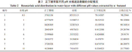 分別以不同pH的水相溶解含量為90%的迷迭香酸樣品,用等體積正丁醇萃取,分相后,高效液相色譜法檢測(cè)上下相,結(jié)果如下:
