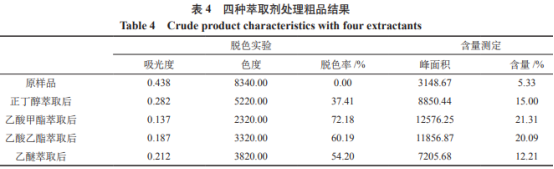 由表4結(jié)果可知:不同萃取劑萃取粗品含量從5.33%增加到12.21%~21.31%,用乙酸甲酯萃取效果最好。
