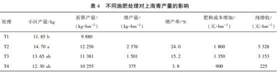 不同施肥處理對上海青和生菜產(chǎn)量的影響分別見表4和表5。