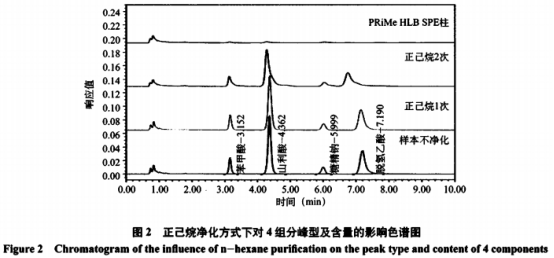 取15mL提取液,加10mL正己烷,渦旋5min,離心后,吸取下層過濾上機(jī)分析制備供試品溶液,上機(jī)測定,計(jì)算4組分在不同蛋白沉淀劑加入量所得含量,從表中可以看出,沉淀劑加入量對(duì)月餅影響最大,對(duì)辣條影響次之,對(duì)糕點(diǎn)影響最小,沉淀劑以加入各2mL為宜,對(duì)于加入沉淀劑后的提取液還渾濁的樣品,可以在提取液中再加入各lmL沉淀劑,不會(huì)對(duì)結(jié)果造成顯著差異。上機(jī)測定,結(jié)果見圖2,對(duì)大部分樣品而言,正己烷萃取1次可降低樣品基質(zhì)效應(yīng),使樣品檢出含量變大,正己烷萃取2次,則會(huì)帶走目標(biāo)物質(zhì),PRiMeHLB小柱,對(duì)目標(biāo)組分存在吸附,試驗(yàn)最終選擇正己烷提取1次。