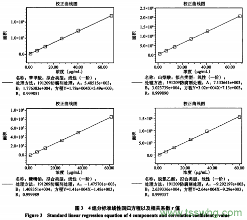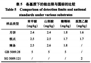 分別精密量取苯甲酸對照品51.28mg置25mL量瓶中,加甲醇溶解并稀釋至刻度,搖勻,即得濃度為2.0471mg/mL的苯甲酸儲備液;稱取山梨酸對照品51.88mg置25mL量瓶中,加甲醇溶解并稀釋至刻度,搖勻,即得濃度為2.0690mg/mL的山梨酸儲備液;稱取糖精鈉對照品55.10mg置25mL量瓶中,加水溶解并稀釋至刻度,搖勻,即得濃度為1.9007mg/mL的糖精鈉儲備液,糖精鈉相對分子質(zhì)量為205.16,糖精相對分子質(zhì)量為182.16,兩者折算系數(shù)為0.8874,故折算為糖精濃度為1.6867mg/mL;稱取脫氫乙酸對照品51.71mg置25mL量瓶中,加20g/L氫氧化鈉4mL溶解,用水定容至刻度,即得濃度為2.0477mg/mL的脫氫乙酸儲備液,對照品儲備液5.0mL至100mL容量瓶中,以水定容的混合標準使用液0.00mL、0.1mL、0.5mL、1.0mL、2.0mL、3.0mL,分別至10mL容量瓶中,加水稀釋并定容至刻度,搖勻,即得到標準線性。