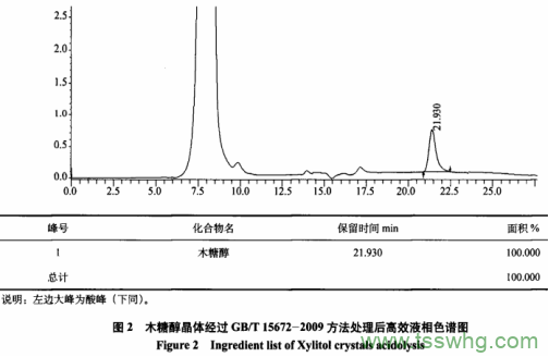 由結果分析可知:不記酸的含量,木糖醇純度100%,之前所含的少量雜質(zhì)在酸解液中占比極微已檢測不出,木糖醇經(jīng)酸解處理后沒有分解,木糖醇耐酸度高。因木糖醇本身沒有還原性,對后續(xù)總糖含量計算沒有影響,使用酸解法對添加木糖醇的產(chǎn)品進行總糖含量檢測時能夠準確的反映產(chǎn)品中總糖含量。
