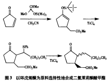YasuyukiKita等人用一種含硅試劑與環(huán)戊烯酮反應(yīng)選擇性地合成二氫茉莉酮酸甲酯(圖3),產(chǎn)率為35%,得到的順式異構(gòu)體與反式異構(gòu)體之比為1/99,該路線的優(yōu)點是合成路線短,缺點是順式異構(gòu)體的產(chǎn)率及純度都很低。