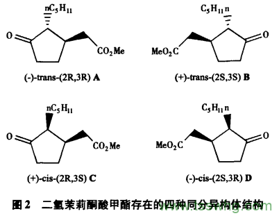 20世紀(jì)70年代,Naoshima等人研究發(fā)現(xiàn)二氫茉莉酮酸甲酯存在A、B、C、D四種異構(gòu)體(圖2),且四個異構(gòu)體的香氣特征與香氣強度各不相同。后來,經(jīng)過香料化學(xué)家的詳細(xì)研究后發(fā)現(xiàn),反式異構(gòu)體的閾值為1.85ng/L,而順式異構(gòu)體的閾值僅為0.028ng/L,C異構(gòu)體的香氣強度是A的70多倍,更是其它兩個構(gòu)型的1000倍左右,且香氣最純正,具有幽雅柔和的茉莉花、香韻和舒適的檸檬樣果香氣息,整個香氣輕盈飄逸。后來該異構(gòu)體被科學(xué)家稱之為天堂酮(Hedi—one)。目前高品質(zhì)的順式-二氫茉莉酮酸甲酯的生產(chǎn)廠家都在國外,分別是美國的IFF公司、瑞士的FIRM公司和日本的ZEON公司。