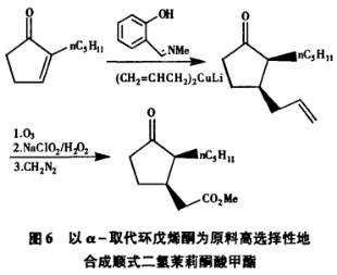 S.Ebert和N.Krause以2一戊基環(huán)戊烯酮為原料,與烯丙基銅鋰試劑反應(yīng),通過鄰N甲基甲胺基苯酚的立體選擇性質(zhì)子化作用,高選擇性地得到順式2一戊基一3一烯丙基環(huán)戊酮,產(chǎn)率為70%,得到的順式異構(gòu)體與反式異構(gòu)體之比為94/6,然后經(jīng)臭氧氧化重氮甲烷酯化得到順式含量為91%的二氫茉莉酮酸甲酯(圖6)。這種方法在提高順式一異構(gòu)體含量方面是一個飛躍,但是該方法存在不足之處,得到的產(chǎn)物為順式異構(gòu)體的消旋體,關(guān)鍵物質(zhì)c異構(gòu)體的含量提高幅度不大,而且反應(yīng)條件比較苛刻,需要低溫和惰性氣體保護(hù)。