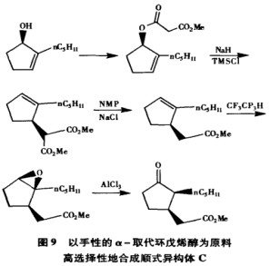 FirmenichSA等人用手性的環(huán)戊醇經(jīng)過酯化重排脫羧,關(guān)鍵一步是用親電的過氧酸氧化脫羧產(chǎn)物得到順式的環(huán)氧,最后在路易斯酸作用下得到產(chǎn)品(圖9)。這條路線的原料需要得到手性醇,這個醇可以由相應(yīng)的酮用酶還原或用手性催化劑來還原。這條路線得到的C異構(gòu)體的ee值高達(dá)98%,該途徑的難點是手性醇的制備和順式環(huán)氧化。
