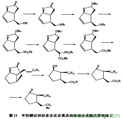 AlessioPorta等采用下列途徑來合成C異構(gòu)體,結(jié)果得到順式/反式為99/1,順式中C異構(gòu)體的ee值高達(dá)93%(圖11)。該途徑存在的缺點是原料不易得到,路線長,總產(chǎn)率低。因此也不適合大量生產(chǎn)。