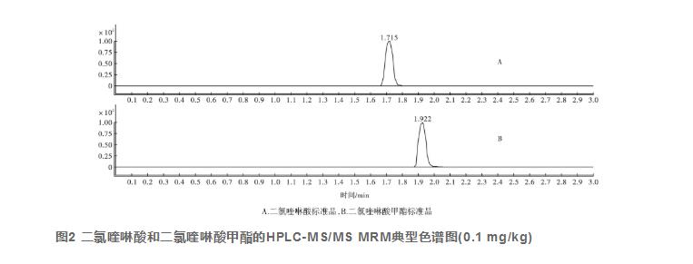 選用C18色譜柱(50mm×2.1mm,1.8μm),設(shè)定流速為0.3mL/min,分別考察了以乙腈-水、甲醇-水、乙腈-0.2%甲酸水溶液和甲醇-0.2%甲酸水溶液為流動相時對2種化合物檢測結(jié)果的影響,梯度洗脫程序同1.4.2節(jié)。結(jié)果表明:選用乙腈-0.2%甲酸水為流動相時,2種化合物分離效果較好,能獲得更高的響應(yīng)值和更好的峰形,在此條件下,二氯喹啉酸和二氯喹啉酸甲酯的保留時間分別為1.71、1.92min(見圖2)。