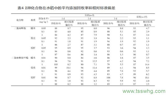 二氯喹啉酸和二氯喹啉酸甲酯在水稻樣品的3種基質(zhì)中,質(zhì)量濃度與相應(yīng)的峰面積呈良好的線性關(guān)系(見表3)。
