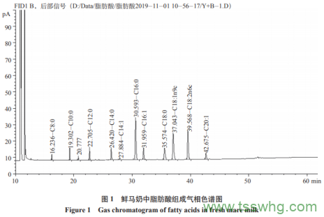 通過上述實(shí)驗(yàn)操作經(jīng)氣相色譜分析后可得到鮮馬奶的脂肪酸組成氣相色譜圖(如圖1),37種脂肪酸甲酯混標(biāo)氣相色譜圖(如圖2)。
