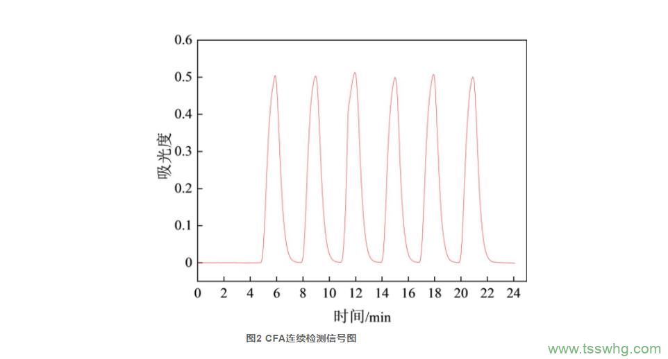 本工作通過泵速優(yōu)化實驗,考察了泵速變化對試劑消耗量、廢液產(chǎn)生量、信號波動、出峰時間和檢測穩(wěn)定性的影響,進而建立水樣中氨氮的CFA在線監(jiān)測方法。