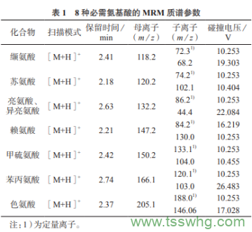 離子源:電噴霧電離(ESI)源;掃描方式:正離子掃描;檢測方式:多反應(yīng)監(jiān)測(MRM)模式;離子源溫度:350℃;離子傳輸管溫度:350℃;離子噴霧電壓:4500V;鞘氣流量:8.0L/min;輔助氣流量:3.0L/min;碰撞氣:氬氣;8種必需氨基酸的MRM質(zhì)譜參數(shù)見表1。