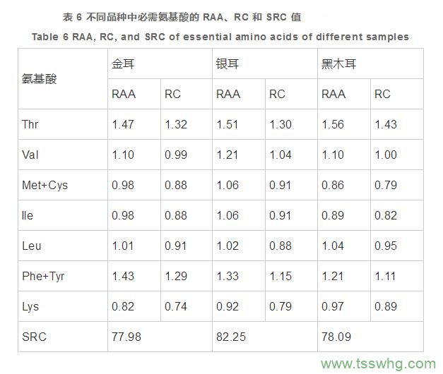 根據(jù)表5中得到的必需氨基酸占總氨基酸的質(zhì)量分?jǐn)?shù),可以計(jì)算出3種膠質(zhì)食用菌的 RAA、RC 和 SRC,從而對其營養(yǎng)價(jià)值進(jìn)行直觀評價(jià),結(jié)果見表6。由表 6 中 RC 值可知,3種膠質(zhì)食用菌過剩和不足的必需氨基酸不盡相同,但總的來說,Thr和Phe+Tyr 在3種膠質(zhì)食用菌中均相對過剩;Val在金耳中稍顯不足,而在銀耳、黑木耳中相對過剩;Met+Cys、Ile、Leu、Lys在3種膠質(zhì)食用菌中均表現(xiàn)為相對不足。SRC是引入氨基酸平衡理論結(jié)合FAO/WHO評價(jià)模式建立的蛋白質(zhì)評價(jià)指標(biāo)。3種膠質(zhì)食用菌 SRC 值由高到低分別為銀耳(82.25)>黑木耳(78.09)>金耳(77.98),均在80左右,三者差別不明顯,說明這3種膠質(zhì)食用菌之間氨基酸營養(yǎng)價(jià)值差別不大。