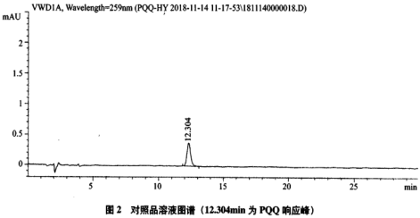 配制對照品溶液和供試品溶液,分別室溫放置12h、24h、36h后進樣檢測,放置后與0h檢測結(jié)果相比,對照品溶液PQQ峰面積變化均不大于4.0%,供試品溶液測定結(jié)果一致,表明溶液在36h內(nèi)穩(wěn)定。