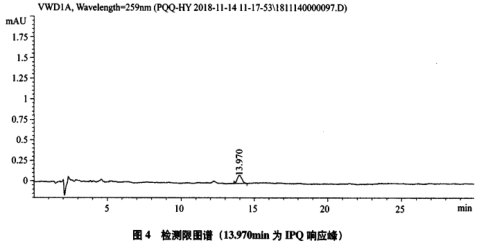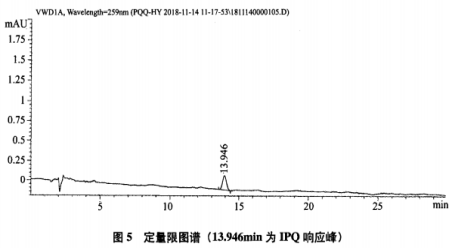取對照品溶液與供試品溶液各20μL,分別注入液相色譜儀,記錄色譜圖,以峰面積按外標法計算供試品中IPQ的含量。