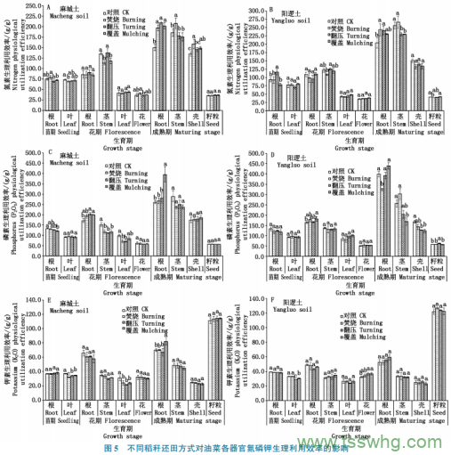 作物養(yǎng)分效率包括養(yǎng)分吸收效率和養(yǎng)分利用效率,在低養(yǎng)分投入下,籽粒產(chǎn)量取決于養(yǎng)分吸收效率,反之養(yǎng)分利用效率起主導(dǎo)作用。提高基于總消耗養(yǎng)分的各種生理效率,既需要從減少養(yǎng)分的損失入手,又需要提高作物吸收的養(yǎng)分在作物體內(nèi)的利用效率來實(shí)現(xiàn)。秸稈覆蓋還田能顯著提高油菜、水稻、小麥、玉米的氮肥農(nóng)學(xué)利用效率,原因是秸稈還田通過自身的氮素分解固氮與增加外源氮的固定量,從而提高氮肥利用效率,也可能與秸稈還田對(duì)土壤水庫的擴(kuò)蓄增容作用,在提高作物水分利用效率的同時(shí)使養(yǎng)分利用效率相應(yīng)提高。然而也有研究認(rèn)為,如果基礎(chǔ)土壤鉀素含量較高,秸稈還田對(duì)水稻和冬油菜的鉀肥吸收效率沒有顯著影響,但均使2種作物的鉀素利用效率顯著降低,可能原因是秸稈還田條件下當(dāng)前推薦鉀肥用量偏高。本研究結(jié)果表明,稻稈還田能提高油菜全生育期氮磷鉀積累量,覆蓋還田能顯著提高油菜氮磷鉀吸收效率,但氮磷鉀生理利用效率因器官的不同而有差異,養(yǎng)分收獲指數(shù)也因處理和元素的不同而有增加、持平或下降的不同表現(xiàn)。但是盡管如此,相比CK,除麻城土翻壓處理苗期和花期的氮磷鉀吸收效率與覆蓋處理差異不顯著外,覆蓋處理各生育期的氮磷鉀吸收效率均顯著高于其他處理。前人研究已表明,秸稈還田可以提高油菜氮磷鉀積累量和農(nóng)學(xué)利用效率,但養(yǎng)分收獲指數(shù)均降低,原因是油菜吸收的養(yǎng)分更多用于營養(yǎng)體建成,為籽粒形成奠定基礎(chǔ)。相比水稻、小麥等作物,油菜的收獲指數(shù)相對(duì)偏低,營養(yǎng)生長需要枝繁葉茂才能為生殖萬方數(shù)據(jù)生長的籽粒形成提供基礎(chǔ)。