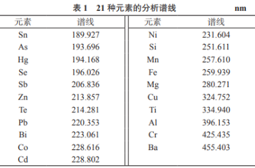 21種元素混合標準溶液:分別移取1.0mLSb、Se、Te混合標準溶液和Al、As、Bi、Cd、Co、Cr、Cu、Fe、Mg、Mn、Ni、Pb、Si、Sn、Ti、Zn混合標準溶液以及0.10mL鋇、汞單元素標準溶液于50mL容量瓶中,加入純水定容至標線,配制成21種待測元素的質(zhì)量濃度均為20μg/mL的混合標準溶液。21種元素系列混合標準工作溶液:將21種元素混合標準溶液用純水逐級稀釋成各元素質(zhì)量濃度均分別為0、0.5、1.0、1.5、2.0、4.0μg/mL的系列混合標準工作溶液。