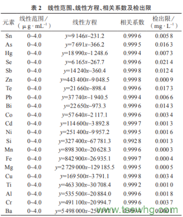 按照1.2儀器工作條件,對(duì)21種元素的系列混合標(biāo)準(zhǔn)工作溶液進(jìn)行測(cè)定,以21種元素的質(zhì)量濃度(x)為橫坐標(biāo),光譜強(qiáng)度(y)為縱坐標(biāo)繪制標(biāo)準(zhǔn)工作曲線。依據(jù)IUPAC定義計(jì)算得出方法檢出限,對(duì)空白溶液進(jìn)行20次測(cè)量,其3倍標(biāo)準(zhǔn)偏差為方法檢出限。21種元素的線性范圍、線性回歸方程、線性相關(guān)系數(shù)及檢出限見(jiàn)表2。由表2可知,各元素質(zhì)量濃度在0~4.0μg/mL范圍內(nèi)與光譜強(qiáng)度具有良好的線性關(guān)系,線性相關(guān)系數(shù)均大于0.992,檢出限為0.0001~0.0214mg/L,表明該方法具有較高的靈敏度。