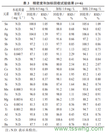 由表3可知,以硫氰酸鉀作為沉淀劑,21種元素分別在0.5、1.0、2.0mg/L3種加標(biāo)濃度下,回收率依次為81.5%~109.6%、80.0%~108.6%、81.2%~116.8%,測(cè)定結(jié)果的相對(duì)標(biāo)準(zhǔn)偏差(n=6)分別為0.35%~1.96%、0.41%~2.54%、0.32%~2.07%,表明該方法有較高的準(zhǔn)確度與精密度,滿足分析測(cè)試質(zhì)量控制要求。