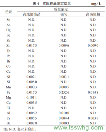 采用所建方法對(duì)市面上銷(xiāo)售的高純銀飾品(銀含量標(biāo)稱(chēng)值為999.9‰)、銀勺(銀含量標(biāo)稱(chēng)值為999.9‰)及化學(xué)試劑中的高純銀粉(銀含量標(biāo)稱(chēng)值為999‰)分別進(jìn)行測(cè)試,結(jié)果見(jiàn)表4。由表4可知,待測(cè)樣品中檢測(cè)出鋅、鎳、硅、錳、鐵、鎂、銅、鋁、鉻、鋇等雜質(zhì)元素。與之相比,現(xiàn)行國(guó)家標(biāo)準(zhǔn)GB/T38162-2019測(cè)試元素中不包含鋇元素,而GB/T11067-2016系列標(biāo)準(zhǔn)中則不包含鎳、錳、硅、鎂、鋁、鉻、鋇7種元素的測(cè)試方法,因此所建方法可覆蓋更多非貴金屬雜質(zhì)元素,適用于高純銀制品中雜質(zhì)元素含量的測(cè)定。