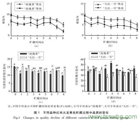 果皮硬度和果肉硬度是反映火龍果耐貯性的重要指標(biāo),能夠直觀反映火龍果果實(shí)采后軟化的程度。如圖1a和圖1b所示,在25℃貯藏條件下,隨著貯藏時間的延長,火龍果的果皮硬度和果肉硬度逐漸下降,貯藏后期隨著腐敗嚴(yán)重,硬度下降很快。“玫瑰香”品種在第3天和第5天,“大紅一號”品種在第2天和第5天硬度均有上升現(xiàn)象,可能是由溫度較高,火龍果過度失水導(dǎo)致。“玫瑰香”品種火龍果在貯藏期問,果皮硬度下降了45.86%,果肉硬度下降了68.35%:“大紅一號”品種火龍果在貯藏期間,果皮硬度下降了46.68%。果肉硬度下降了59.28%。