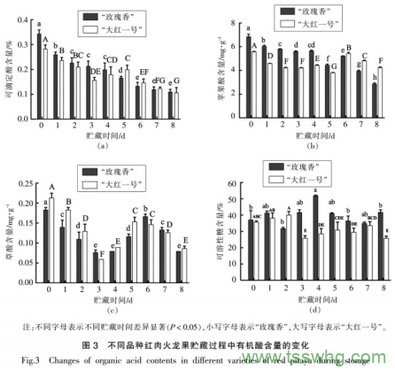有機(jī)酸含量是影響果實(shí)風(fēng)味品質(zhì)的重要因素,不同的主要有機(jī)酸種類構(gòu)成了果實(shí)特殊的風(fēng)味。“玫瑰香”品種火龍果和“大紅一號”品種火龍果的可滴定酸含量如圖3a所示,在貯藏期間呈現(xiàn)下降趨勢,這是由于有機(jī)酸作為呼吸底物,通常在TCA循環(huán)中被降解。通過測定“玫瑰香”品種和“大紅一號”品種火龍果中7種有機(jī)酸(分別為蘋果酸、草酸、酒石酸、檸檬酸、琥珀酸、富馬酸和乳酸)含量的變化趨勢,得出蘋果酸為2個品種火龍果中含量最高的有機(jī)酸,這與Bellec等的研究結(jié)果一致,說明可滴定酸含量下降主要是由蘋果酸含量下降導(dǎo)致的。