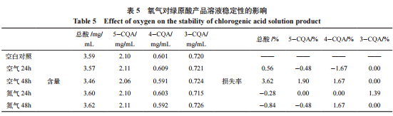 在通入空氣的情況下,48h后總綠原酸損失率為3.62%,而通氮氣的樣品則無損失。數(shù)據(jù)表明,在0~24h內(nèi),綠原酸產(chǎn)品溶液受到氧氣影響減少0.56%,而放置48h后減少3.62%,說明綠原酸產(chǎn)品溶液會在有氧條件下綠原酸含量逐漸降低。