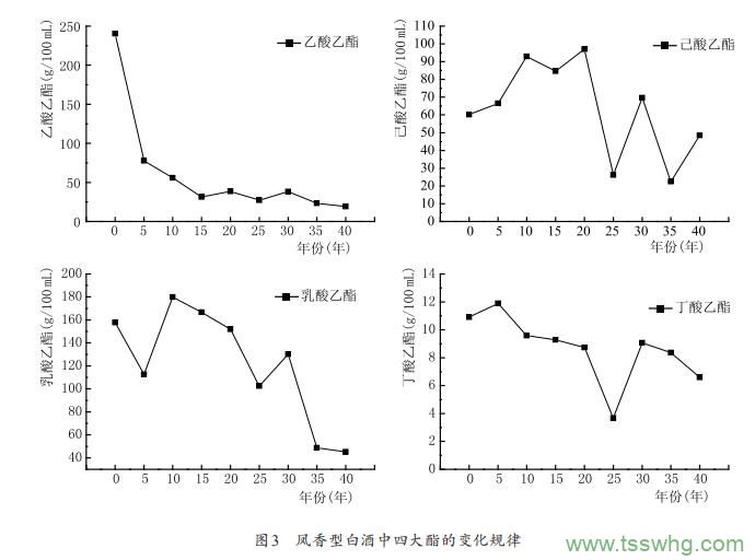另外,主要酯類其總含量在鳳香型基酒新酒中是最高的,為469.27 mg/100 mL,貯存35年的總酯含量是最低的,為102.72 mg/100 mL,其主要酯類總含量的總體是減少的趨勢(shì)。