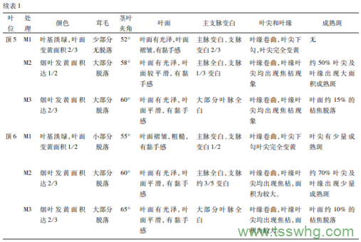 在煙葉采摘時,每個處理選擇具有代表性的葉片記錄煙葉顏色、茸毛、莖葉夾角、葉面狀況、主支脈變白狀況、葉尖和葉緣、成熟斑等成熟特征。