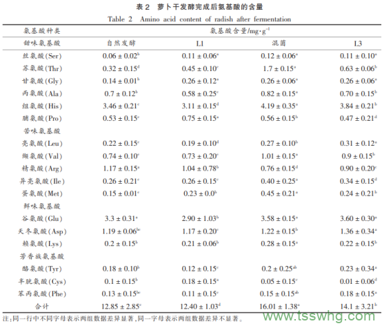 食物中所含氨基酸由兩部分組成:游離氨基酸和非游離氨基酸。游離氨基酸對食品滋味貢獻較大,其中呈味氨基酸對發(fā)酵蔬菜的風(fēng)味形成發(fā)揮了重要的作用。2種乳酸菌對發(fā)酵蘿卜干氨基酸影響的測定結(jié)果如表2和圖9所示。
