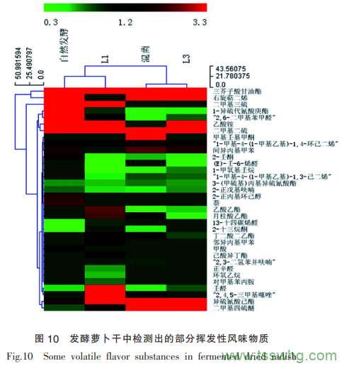 此外,4組蘿卜干中還含有少量的酸類、醇類和呋喃類。其中自然發(fā)酵組和接種L3發(fā)酵組分別檢測出2種和1種酸類物質(zhì),其它2組未檢測到酸類物質(zhì)。醇類物質(zhì)只有在自然發(fā)酵和接種L1發(fā)酵的蘿卜干中檢測出,其它兩組并未檢測出。醇類化合物具有芳香味、植物香和酸敗味等,許多代謝途徑參與了醇類物質(zhì)的生成,如甲基酮還原、氨基酸代謝和脂質(zhì)氧化。4組都含有的呋喃類是2-正戊基呋喃,它有一種果味,熟焦糖味和霉味。這些風(fēng)味物質(zhì)雖然含量和種類都很低,但對蘿卜干風(fēng)味的形成提供了巨大的價值。