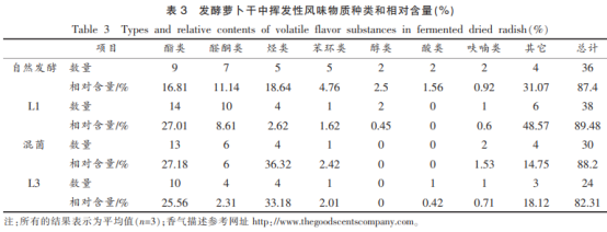 經(jīng)揮發(fā)性風(fēng)味分析和感官評價,3組接種乳酸菌發(fā)酵的蘿卜干都比自然發(fā)酵的口感和風(fēng)味更好,而在接種乳酸菌發(fā)酵的3組蘿卜干中,混菌發(fā)酵的風(fēng)味物質(zhì)種類不是最多但是風(fēng)味評價最好,某些特有的香氣比較突出,如其中的三芥子酸甘油脂、右旋萜二烯和二甲基四硫醚風(fēng)味物質(zhì)與其它3組相比含量都是最高的,對蘿卜干特殊風(fēng)味的形成具有很大貢獻。
