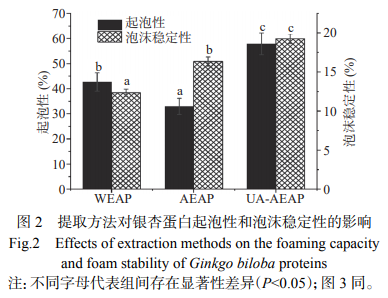 起泡性和泡沫穩(wěn)定性是蛋白質(zhì)應(yīng)用于食品加工中最重要的功能特性之一,前者主要取決于蛋白質(zhì)溶液的溶解度、疏水基團的數(shù)目和肽鏈的柔韌性等因素,而后者主要取決于蛋白質(zhì)溶液的流變學(xué)性質(zhì)。圖2為不同提取方法對銀杏蛋白起泡性和泡沫穩(wěn)定性的影響。由圖2可知,UA-AEAP蛋白的起泡性和泡沫穩(wěn)定性顯著高于AEAP蛋白和WEAP蛋白(P<0.05),可能的原因是超聲產(chǎn)生的空化效應(yīng)降低了銀杏蛋白顆粒聚集體的粒度,同時降低水的界面張力,有利于蛋白分子的快速擴散。AEAP蛋白的起泡性顯著低于WEAP蛋白,但泡沫穩(wěn)定性顯著高于WEAP蛋白(P<0.05),可能的原因是水提法溶液的pH更接近蛋白的等電點,被吸附到界面上的蛋白數(shù)量增加,從而提高了蛋白的起泡性。